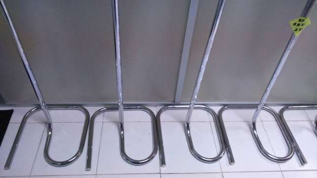Seis suportes metálicos cromados para pendurar objetos em fila sobre piso branco