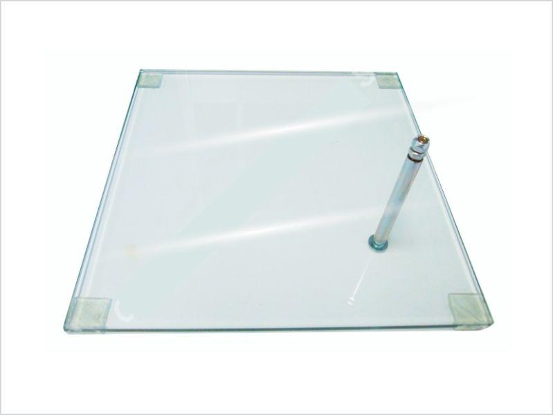 Base quadrada transparente em vidro com suporte metálico e apoios nos cantos