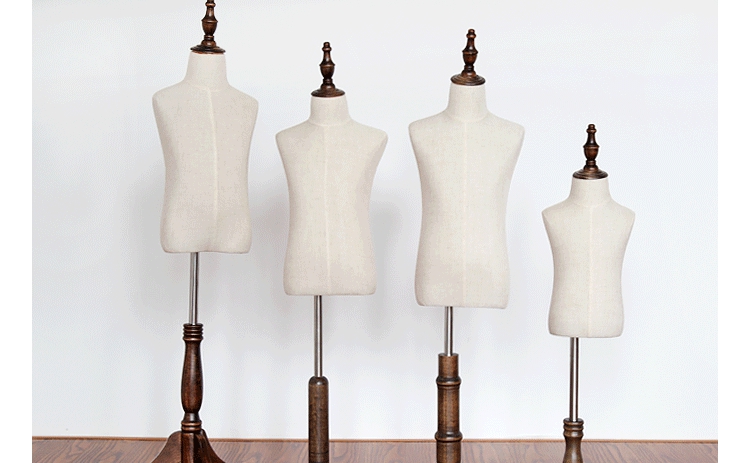 Quatro manequins femininos de diferentes tamanhos com bases em madeira escura