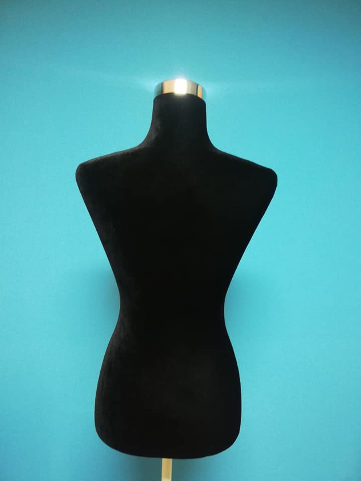 Manequim de corpo feminino em veludo preto com acabamento prateado na parte superior