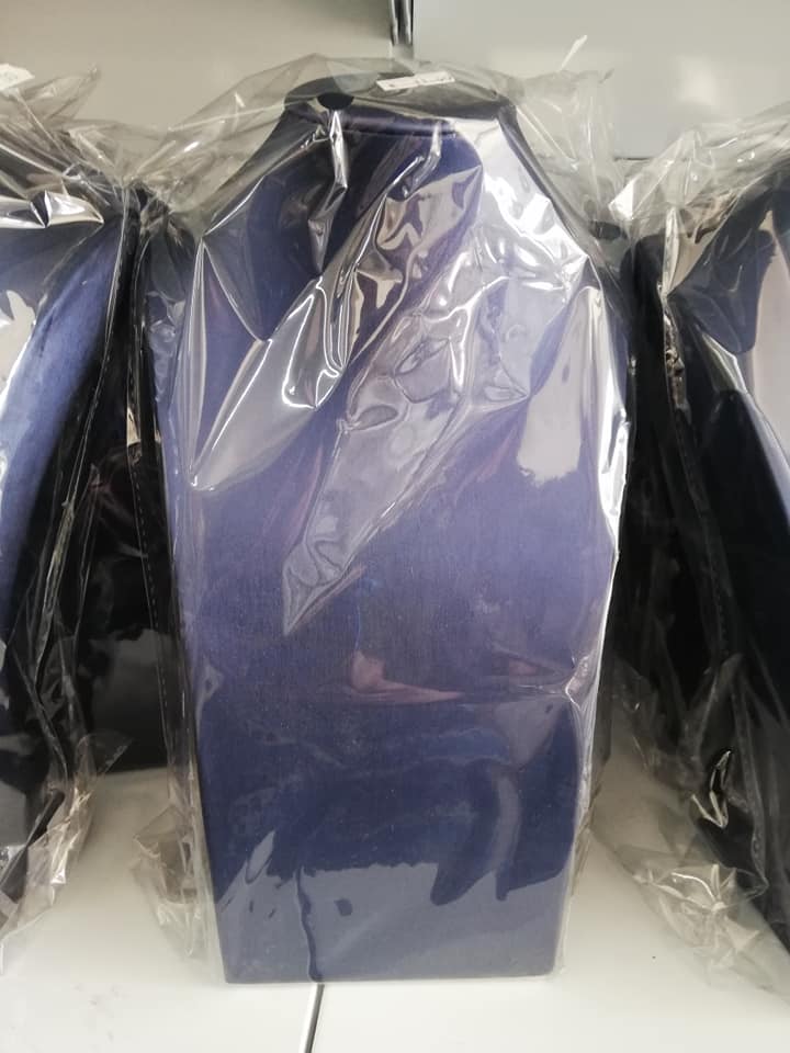 Suporte de veludo azul para colares embalado em plástico transparente
