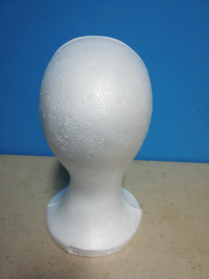 Cabeça de manequim de espuma branca sobre superfície bege com fundo azul