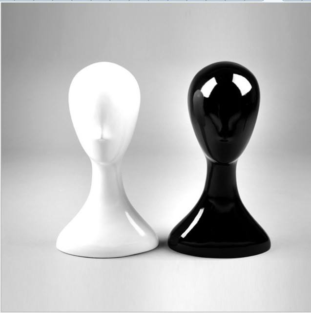 Dois manequins de cabeça, um branco e outro preto, com acabamento brilhante