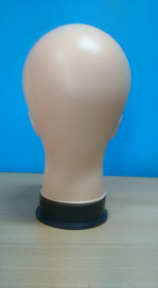 Cabeça de manequim bege de plástico numa base preta sobre mesa clara