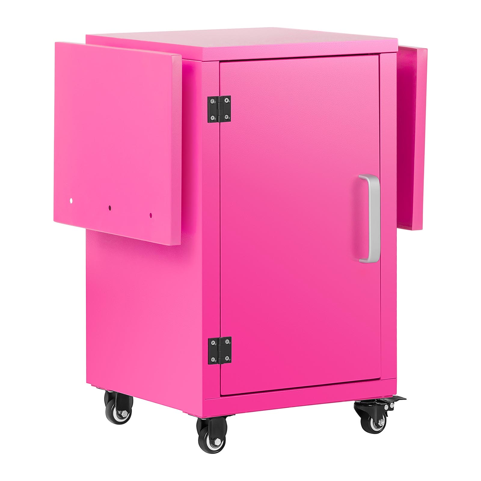 Móvel rosa com tampas laterais dobráveis, porta central e rodas
