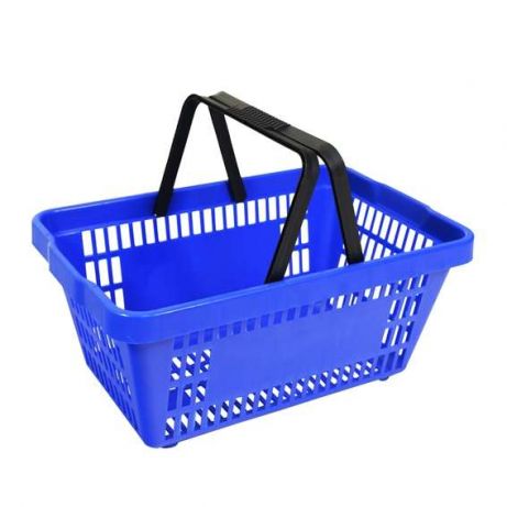 Duas cestas de compras plásticas, azul e vermelha, com pegas de cores diferentes