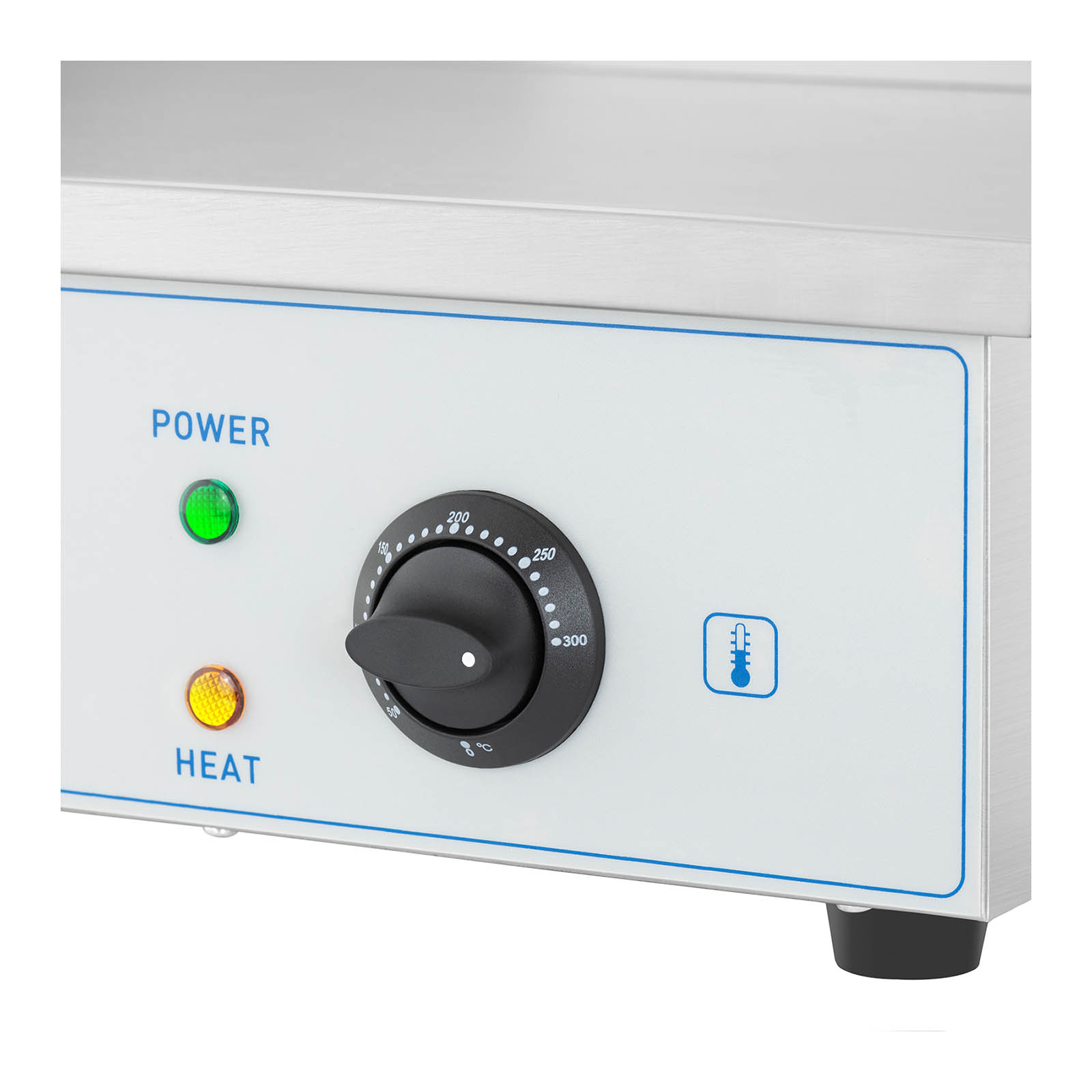 A elevada eficiência do equipamento resulta da potência de 3000 W. A temperatura é regulável dentro de 0-300°C. O grande tamanho da chapa 550 x 350 mm permite fritar muitos alimentos ao mesmo tempo.