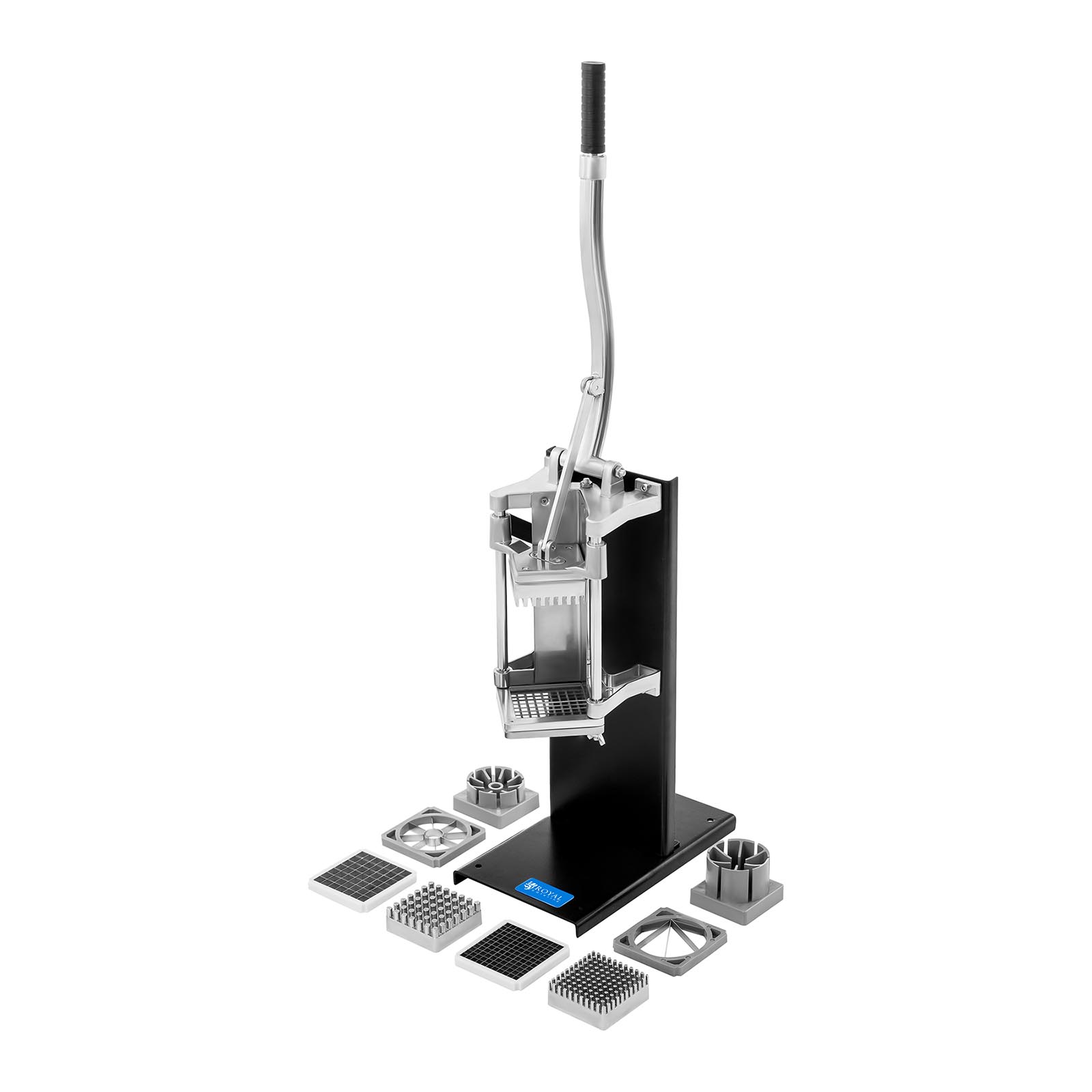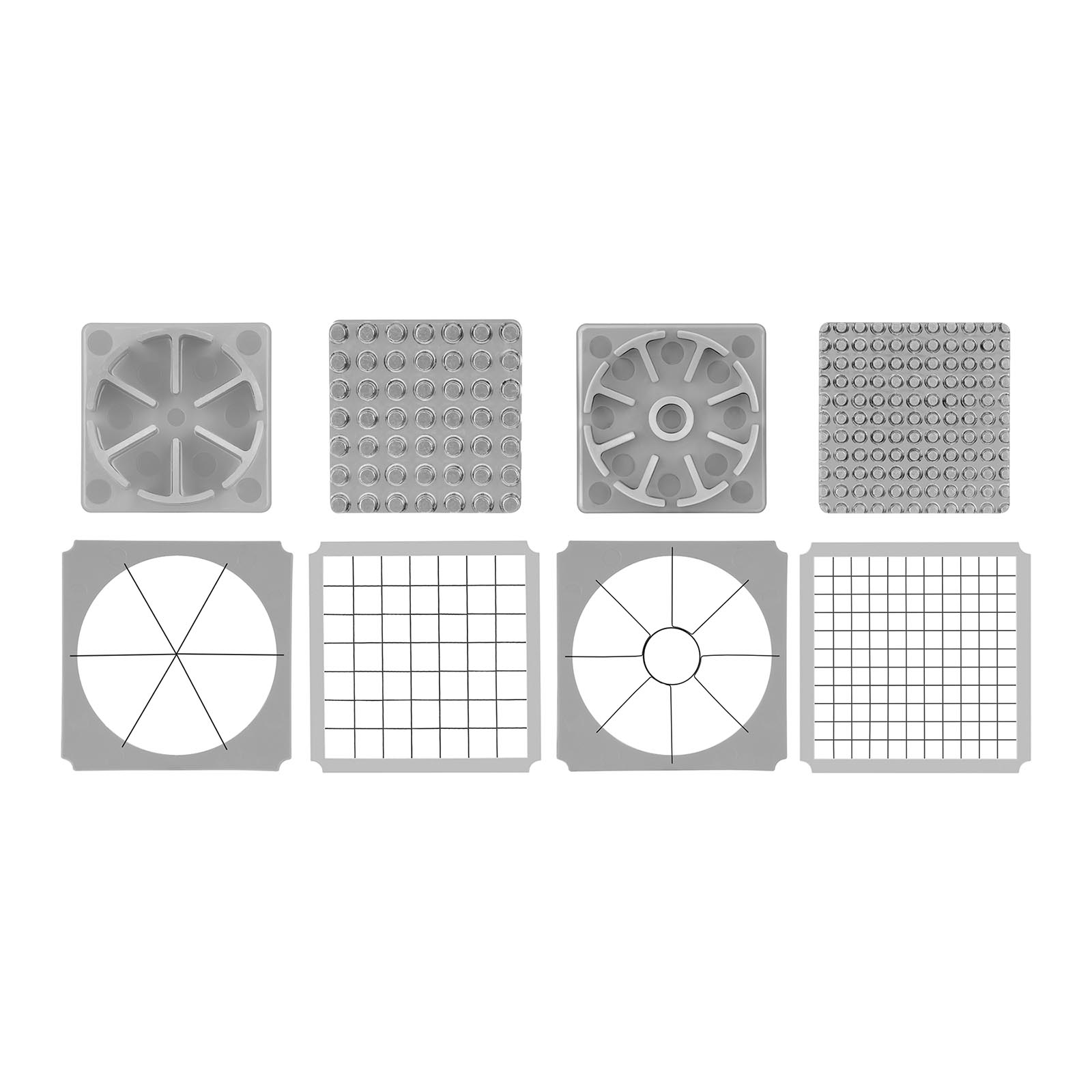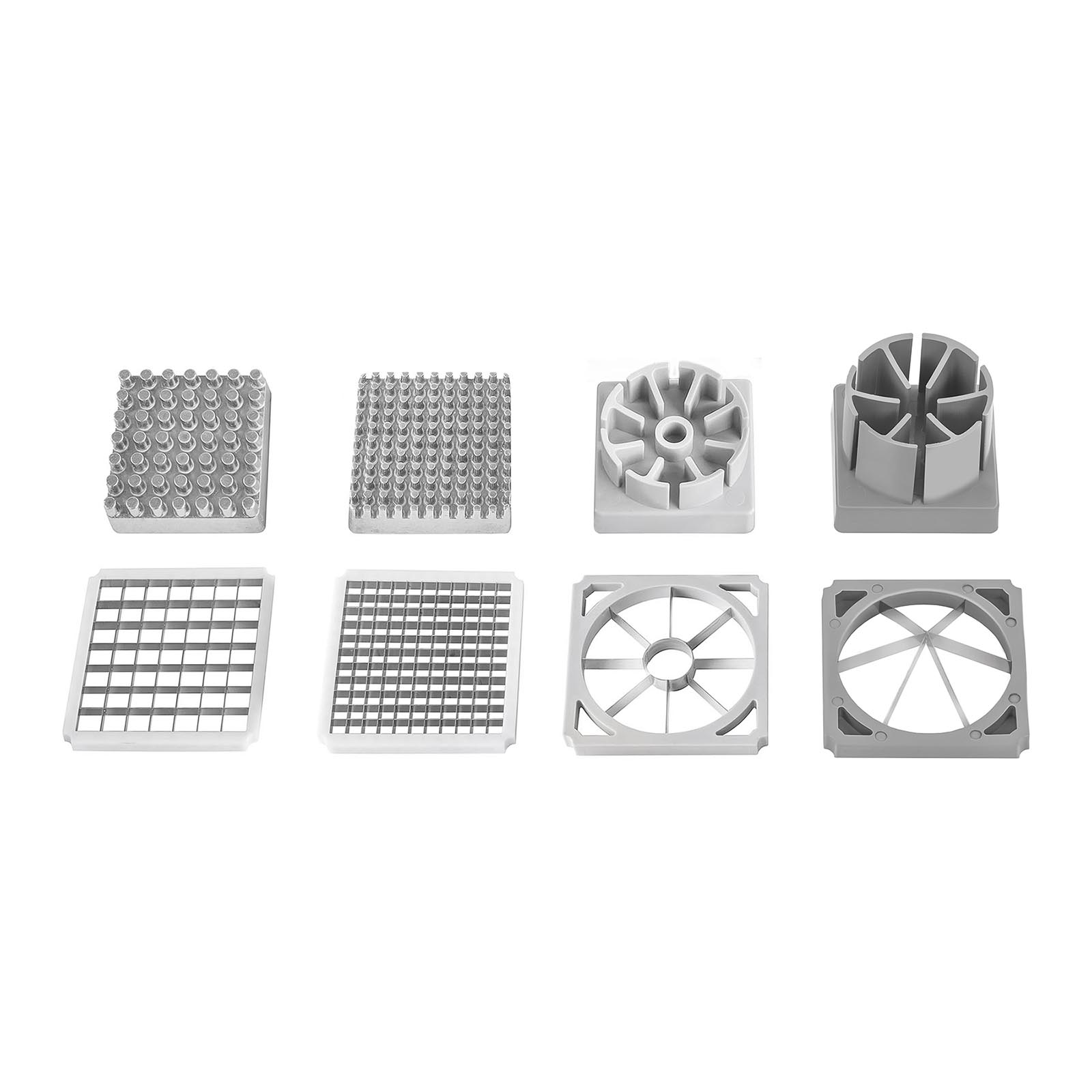 Na encomenda vêm incluídos cinco acessórios de corte, sendo três deles quadrados e os outros dois redondos. Os acessórios quadrados medem, respetivamente, 12 x 12 mm, 10 x 10 mm e 8 x 8 mm. Permitem cortar os alimento em palitos e em cubos. Os acessórios redondos, por sua vez, têm 86 mm de diâmetro e cortam os alimentos em 6 e 8 partes iguais. Todas as lâminas vêm com uma placa de pressão.