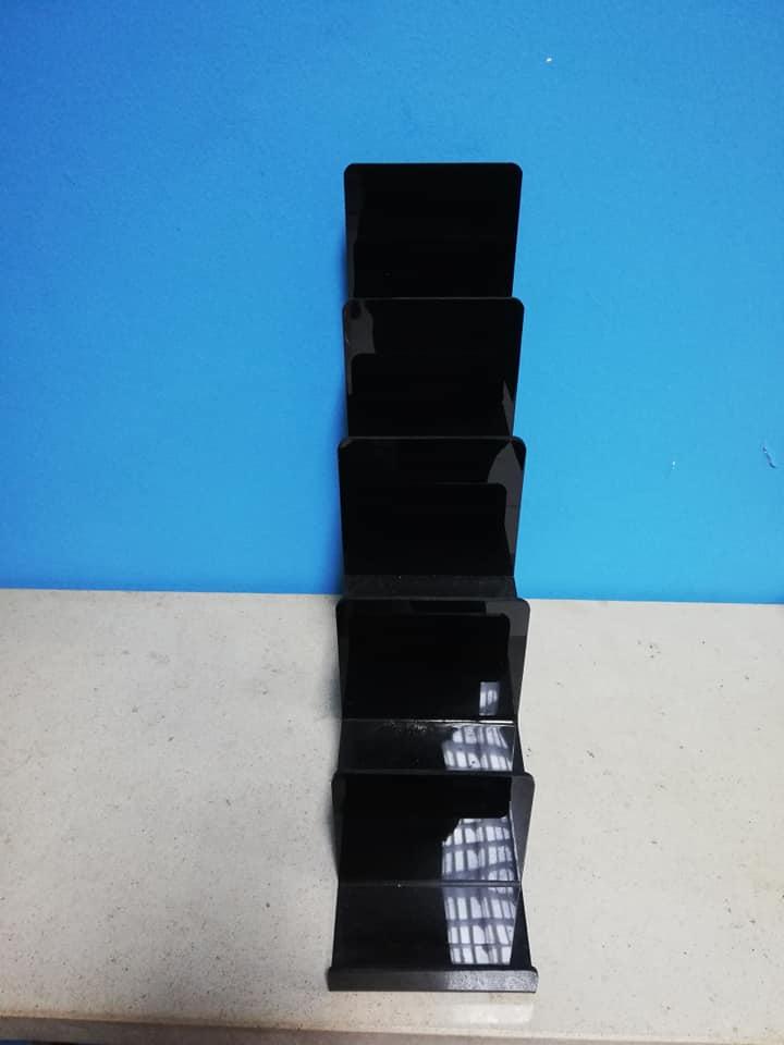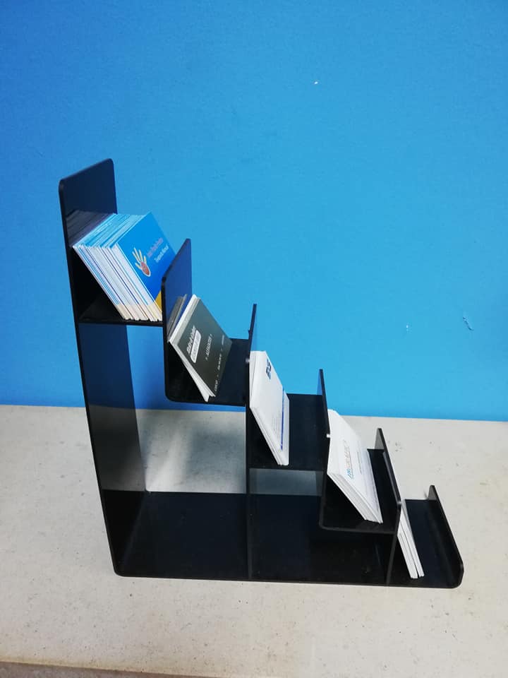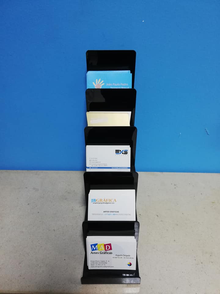 Expositor de cartões de visita preto com cinco níveis sobre superfície clara e fundo azul