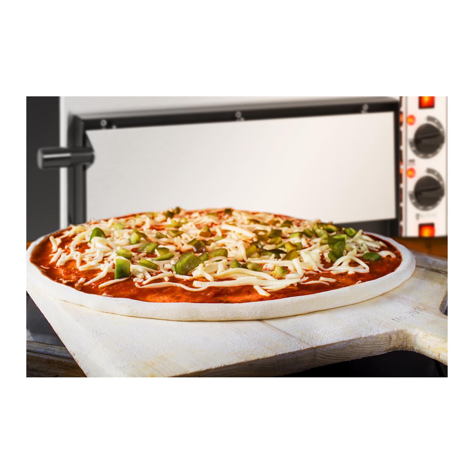 A distribuição uniforme do calor deve-se às placas de pedra resistentes ao fogo. Permitem preparar a massa com uma base crocante. O equipamento é equipado com elementos de aquecimento incorporados. A potência superior é de 2 x 800 W, a inferior é de 1 x 800 W.