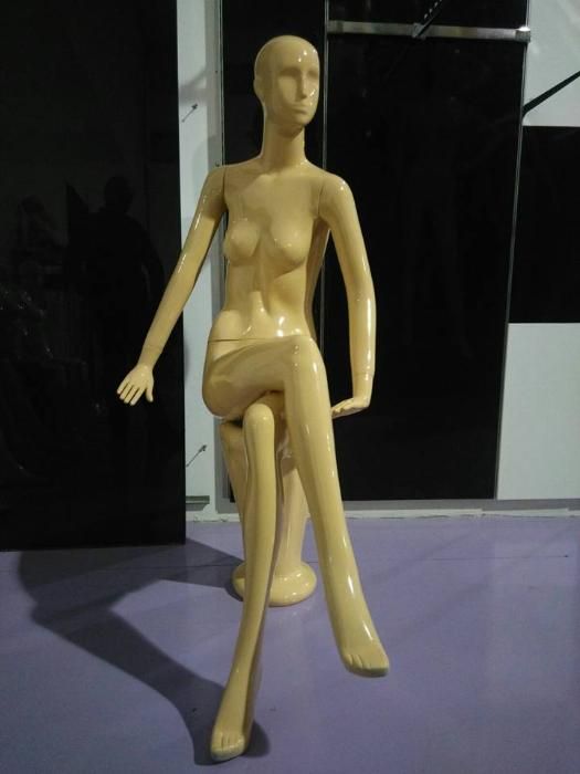 Mannequim feminino bege sentado com pernas cruzadas em superfície roxa
