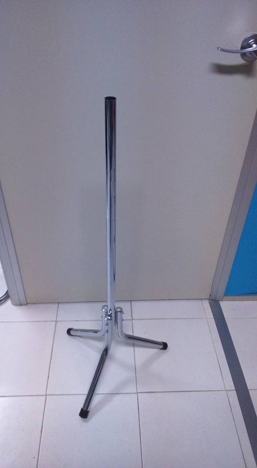 Suporte de metal cromado com três pernas dobráveis no chão branco