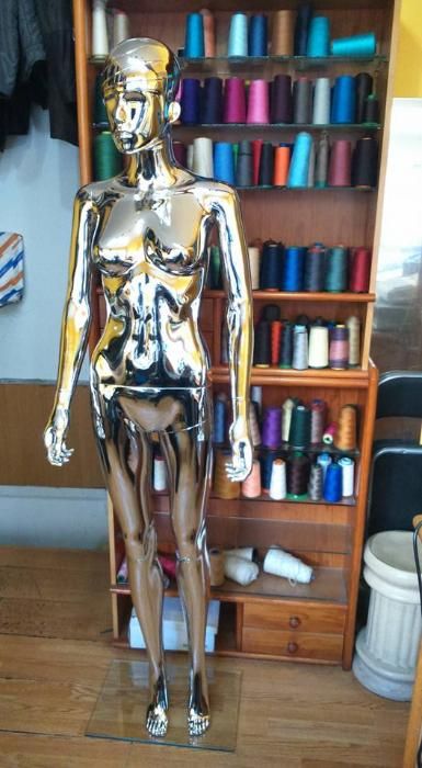 Maniquim cromado de corpo inteiro visto de costas em quarto com estante e carretéis de linha