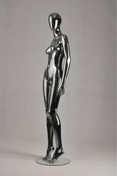 Maniquim feminino metálico prateado em pé sobre base de vidro