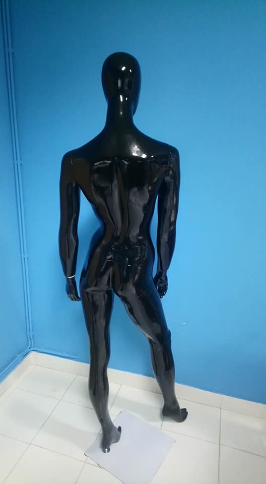 Manequim feminino preto brilhante em pé num ambiente interior com paredes azuis