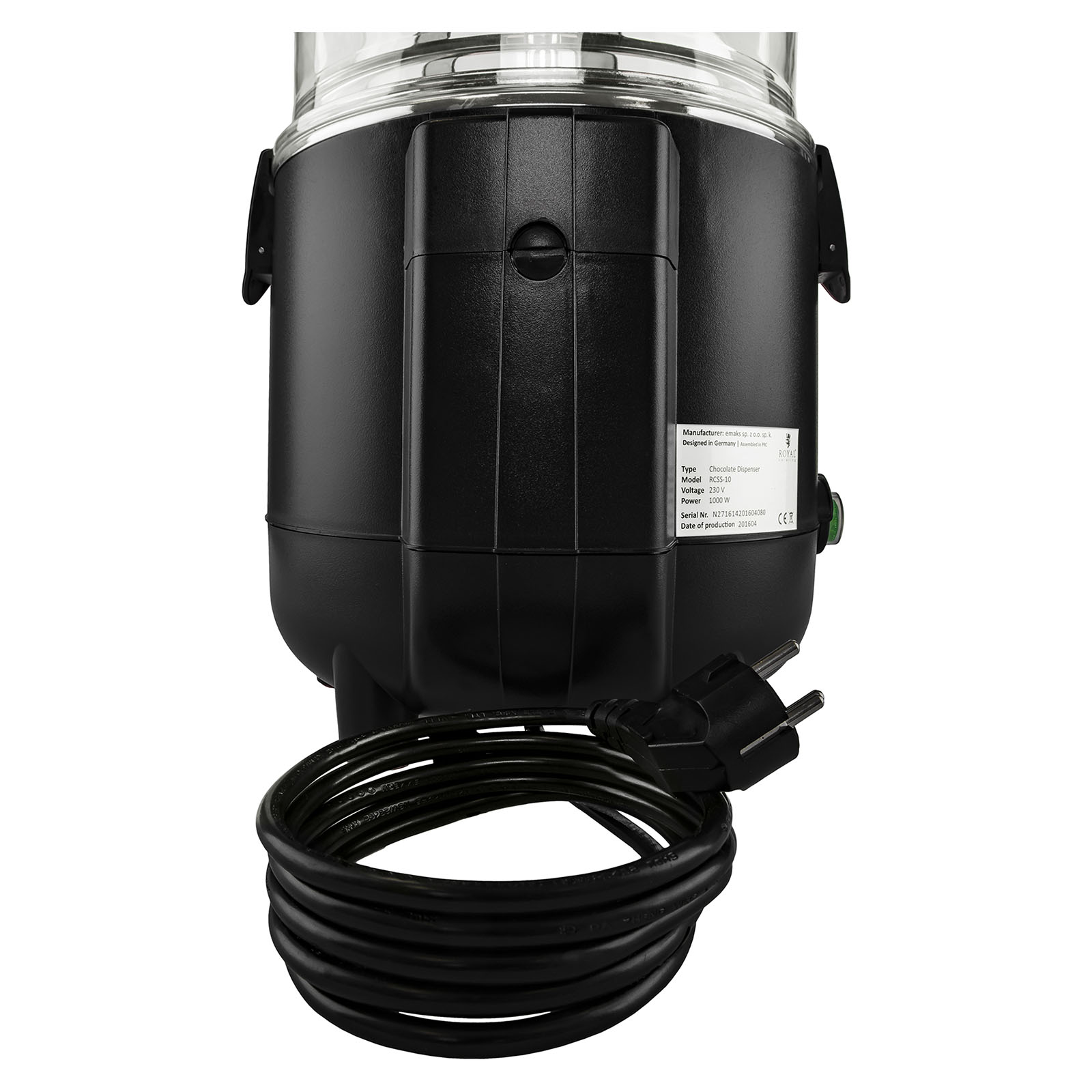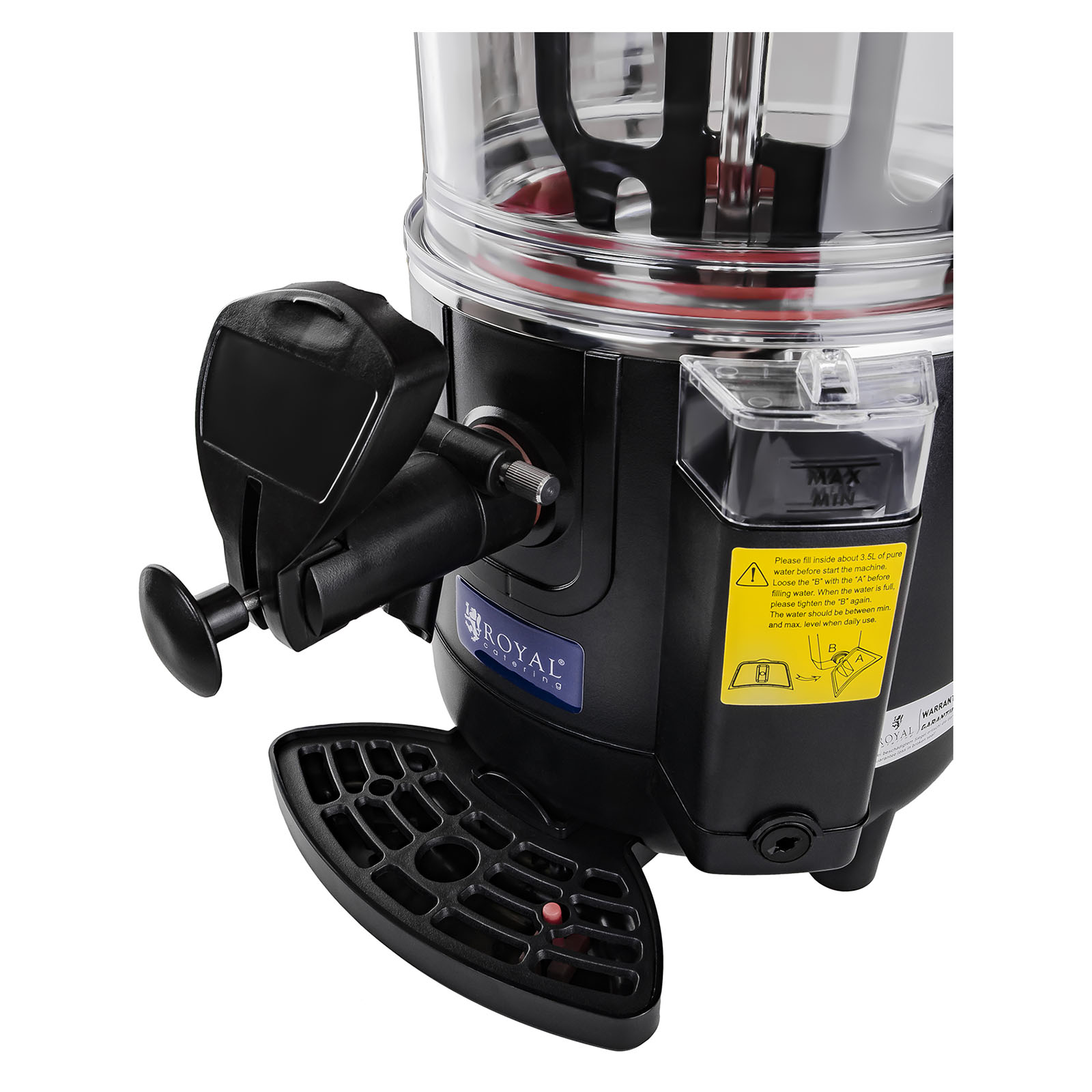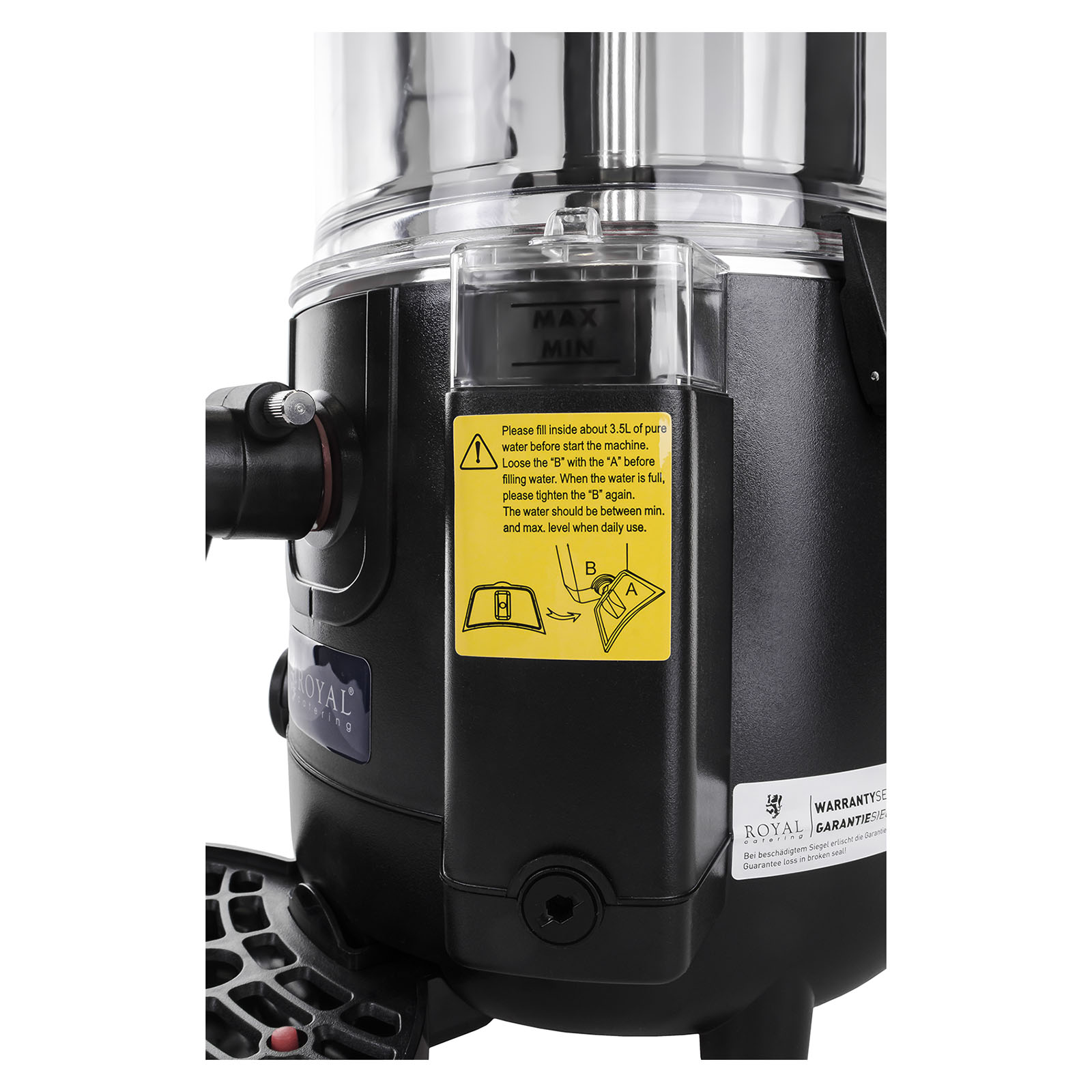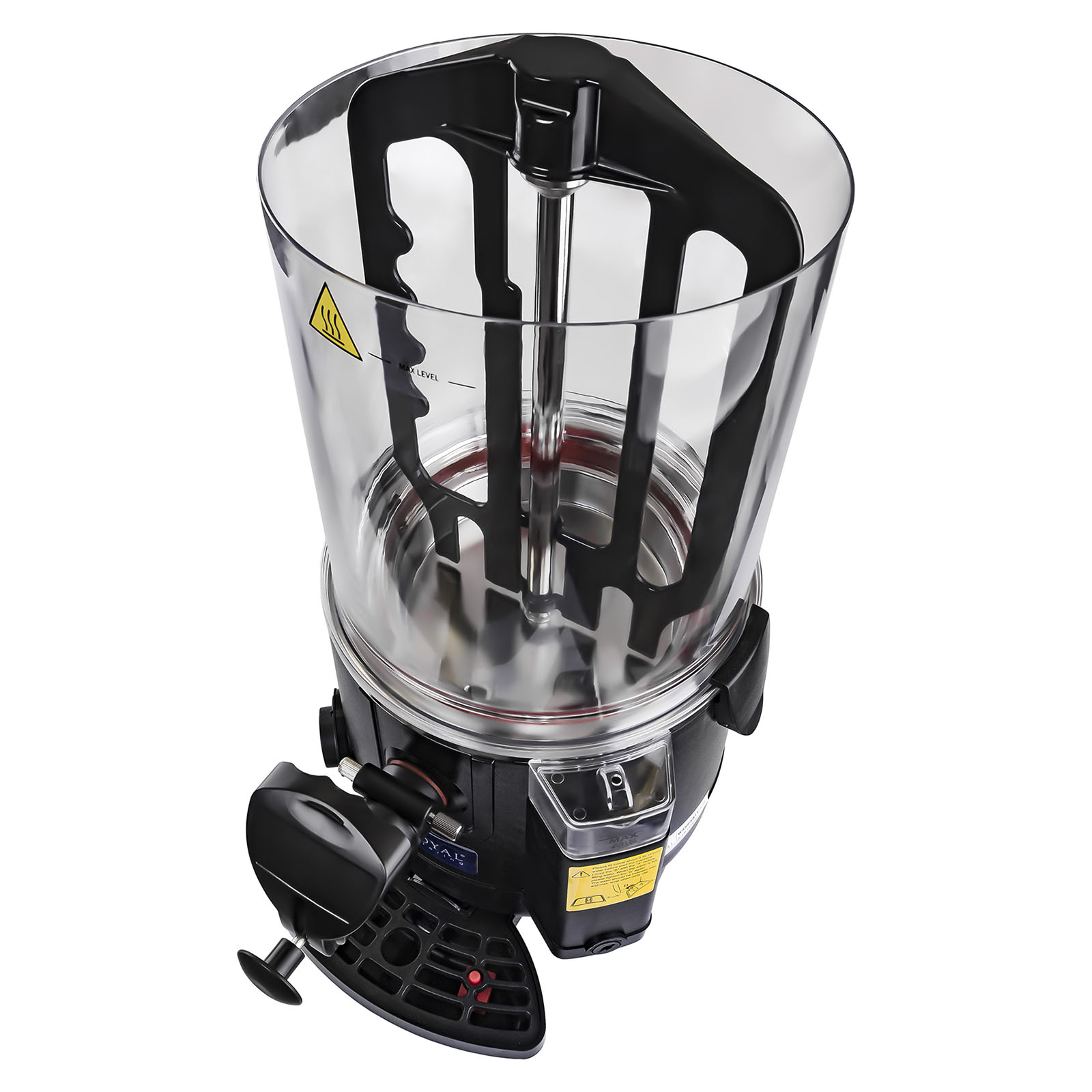 É feita de aço inoxidável de alta qualidade e possui um tabuleiro removível e um recipiente de plástico transparente (também removível), com capacidade para 10 litros, permitindo-lhe preparar grandes quantidades de bebidas. A tampa fecha o recipiente e pode ser removida facilmente graças à pega de isolamento térmico. Na parte inferior do aparelho encontra-se um tabuleiro apara-pingos, o qual impede que as bebidas se entornem. A Máquina de chocolate quente é extremamente robusta, estável e muito fácil de limpar graças aos excelentes materiais utilizados no seu fabrico. Em adição, é bastante silenciosa e permite uma rápida regulação da temperatura até 90 °C.