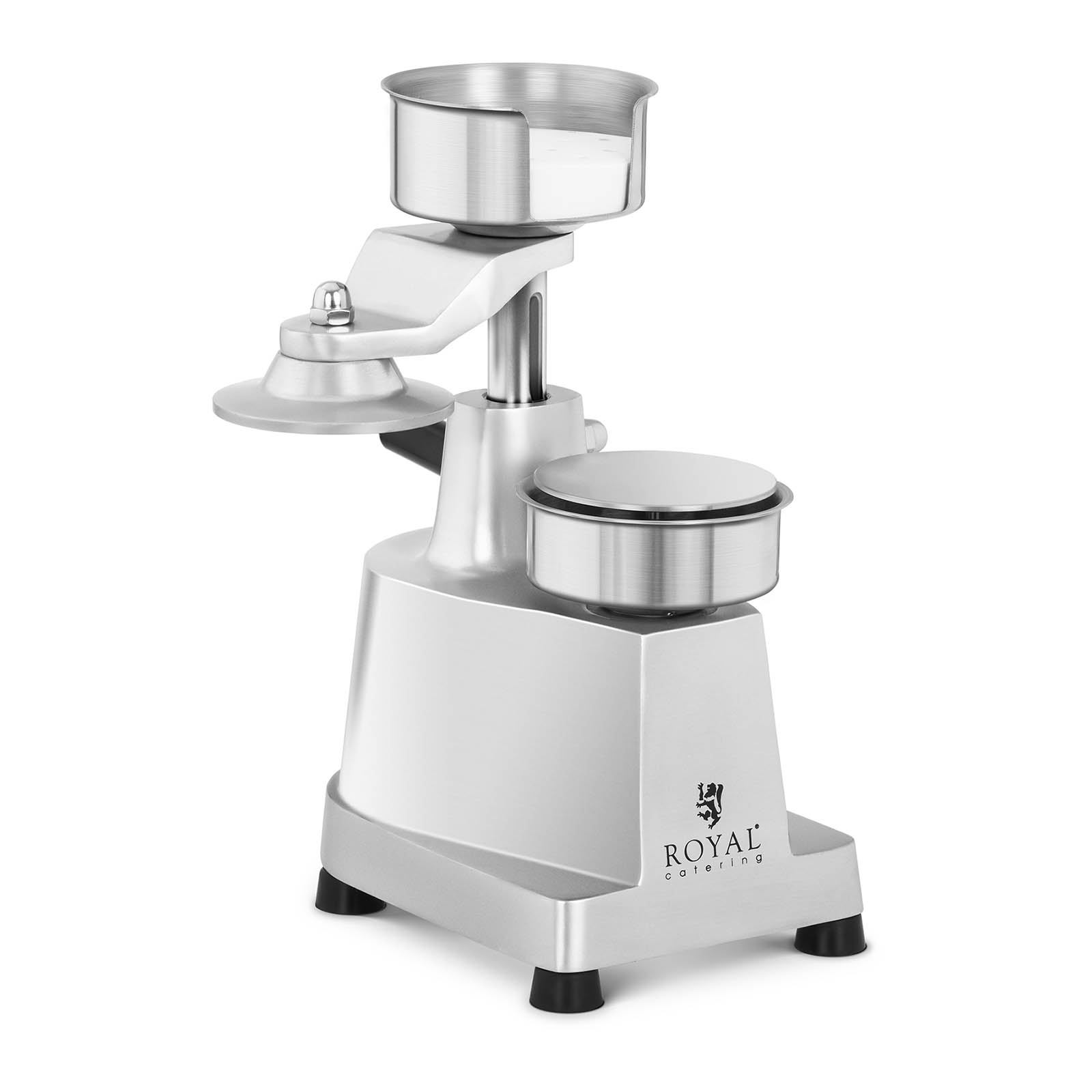 Se quer servir hambúrgueres no seu estabelecimento, então a prensa para hambúrgueres sólida da Royal Catering tornar-se-á um equipamento indispensável da cozinha! O dispositivo extremamente fácil de usar torna possível a preparação de bifes com uma forma e diâmetro perfeitos de 100 mm sempre.