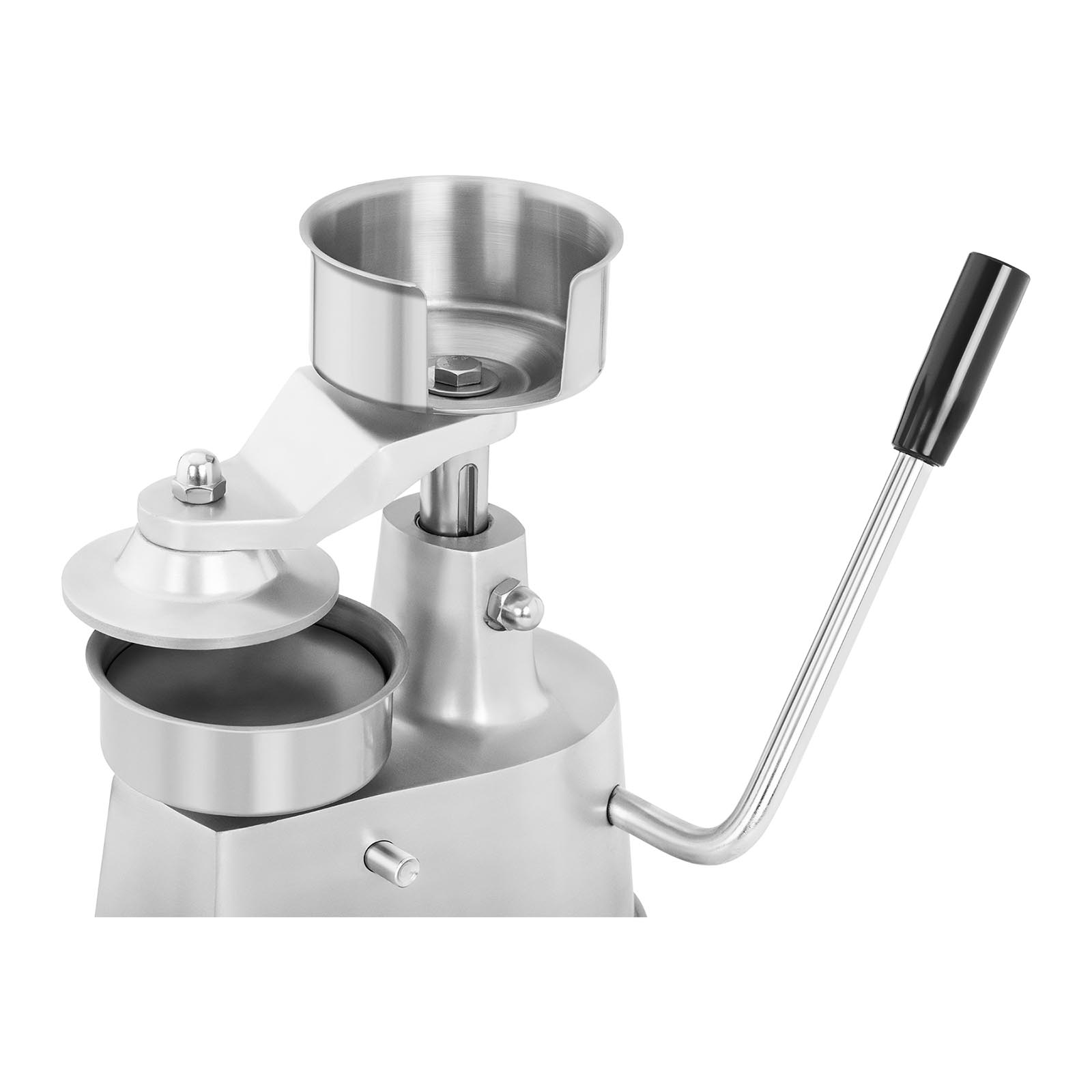 A operação conveniente e simples é assegurada pela alavanca. Pressionar permite formar um bife, e liberar permite retirar os hambúrgueres. A pega em PVC antiderrapante funciona bem mesmo com as mãos gordurosas. O equipamento tem superfícies lisas, por isso é fácil de limpar. Os pés de borracha tornam-no estável sobre a mesa.