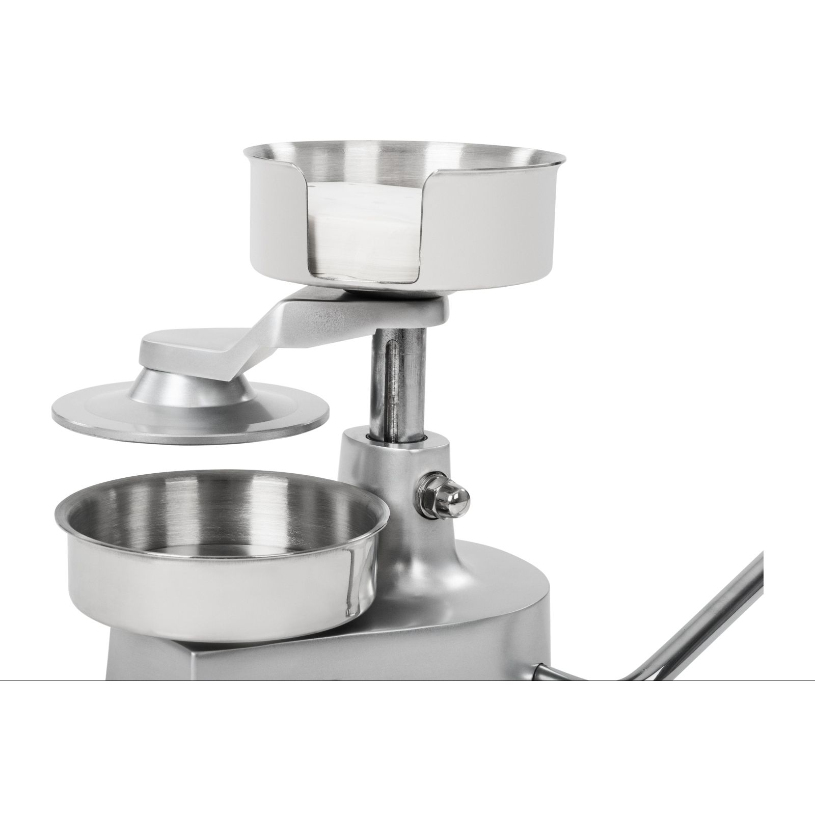 Todas as peças da máquina são facilmente acessíveis e podem ser facilmente limpas com produtos de limpeza convencionais. Devido ao pequeno tamanho, o aparelho é muito compacto e pode ser usado em todas as superfícies de trabalho graças aos pés de borracha antiderrapante. Durante a fase de concepção prestou-se especial atenção em obter um uso fácil para o utilizador, através do qual poderá obter hambúrgeres sempre consistentes e uniformes de 10 cm de diâmetro. A máquina é operada manualmente através de um mecanismo de alavanca, que se aciona sem grande esforço.