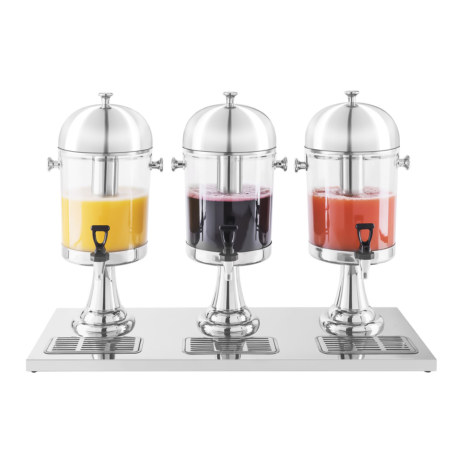 O dispensador de sumo é um destaque em cada pequeno-almoço buffet em hotéis ou restaurantes. Com este dispensador terá sempre bebidas refrescantes como sumos, chás gelados ou refrigerantes à disposição dos seus clientes ou convidados. A integrada bandeja de gotejamento assegura que a área em redor do dispensador esteja limpa e arrumada. A sua limpeza é fácil, bastando apenas retirá-la e esvaziá-la. Cada um dos três recipientes possui uma capacidade de até 7 litros, o que equivale a aproximadamente 105 copos de sumo. Qualquer copo com uma altura de até 14,5 cm pode ser colocado diretamente por baixo da torneira. Por forma a assegurar uma temperatura agradável por mais tempo, cada um dos recipientes possui um tubo especial, o qual pode ser retirado e novamente montado, conforme pretenda. Este tubo especial em aço inoxidável tem uma capacidade de 1 litro e pode ser enchido com cubos de gelo, proporcionando assim bebidas frescas por mais tempo. Em adição, incluem-se três tampas removíveis. O aço inox dos dispensadores garantem robustez e uma fácil limpeza. Graças aos pés de borracha antiderrapantes, o dispensador fica em segurança na maioria das superfícies. Por tudo isto, este dispensador de sumo da Royal Catering é um trunfo para qualquer negócio de restauração.