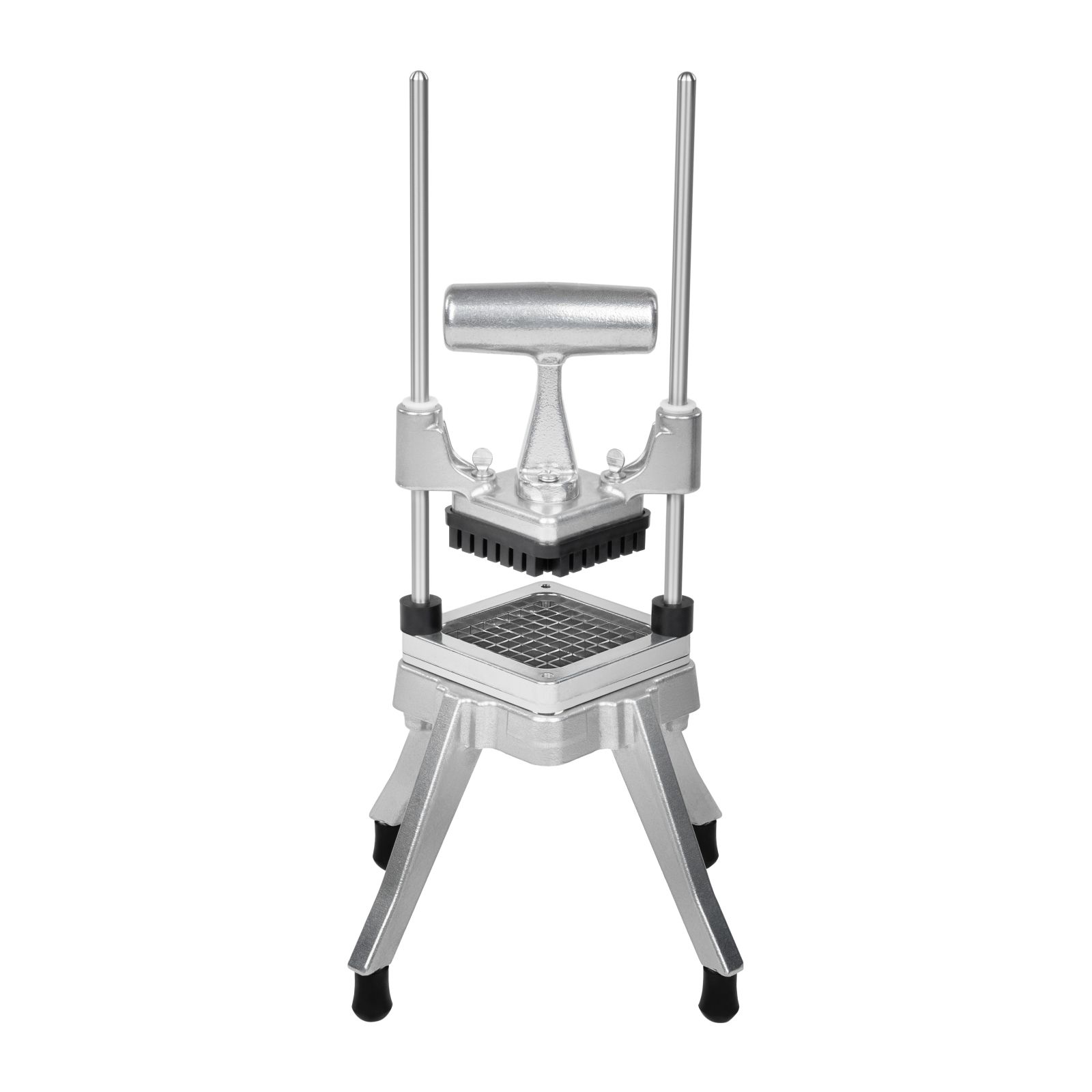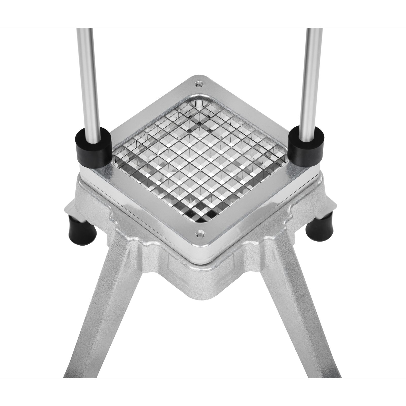 Máquina manual metálica para cortar batatas fritas com base quadrada e quatro pés.