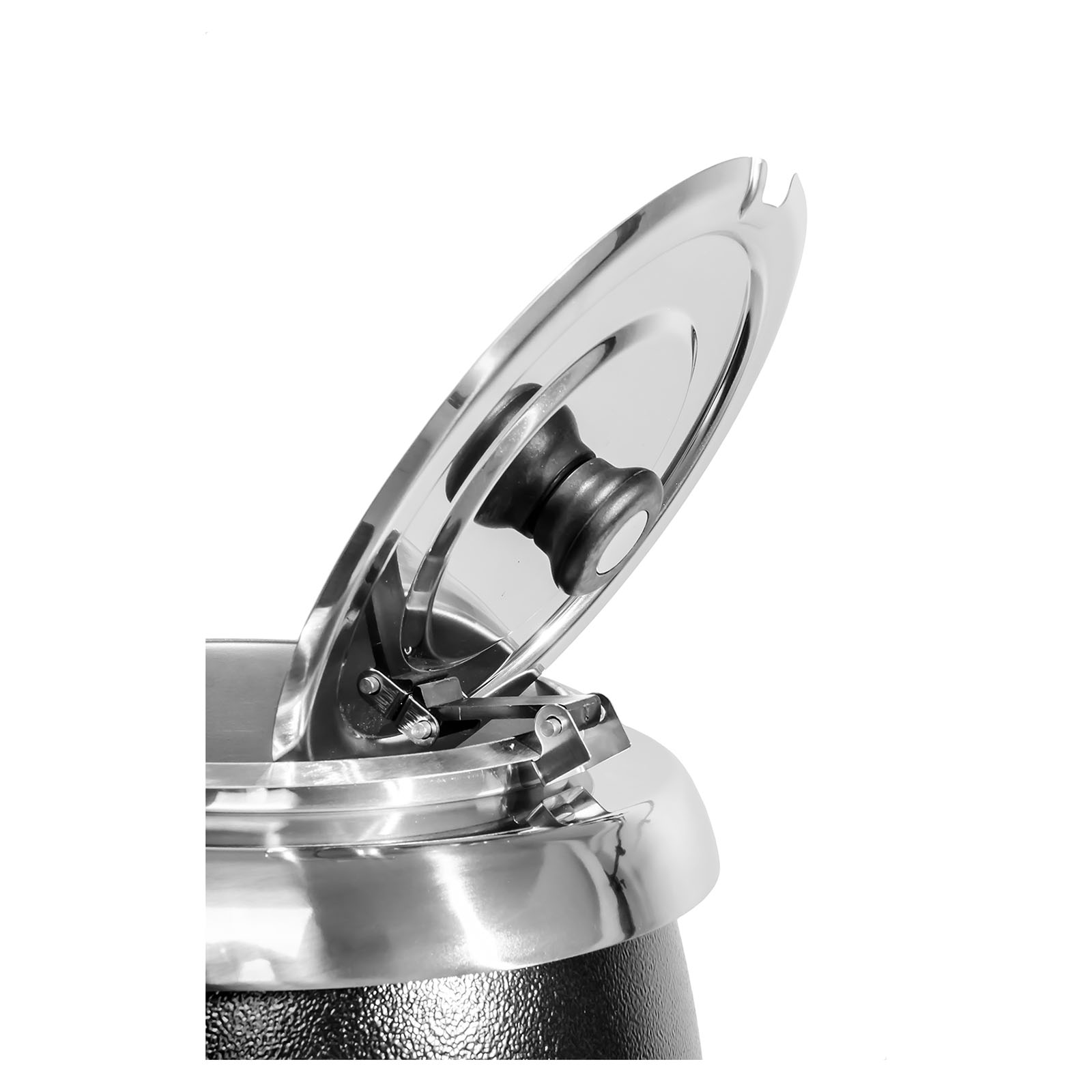 Panela de sopa elétrica redonda preta com tampa metálica e botão de controlo