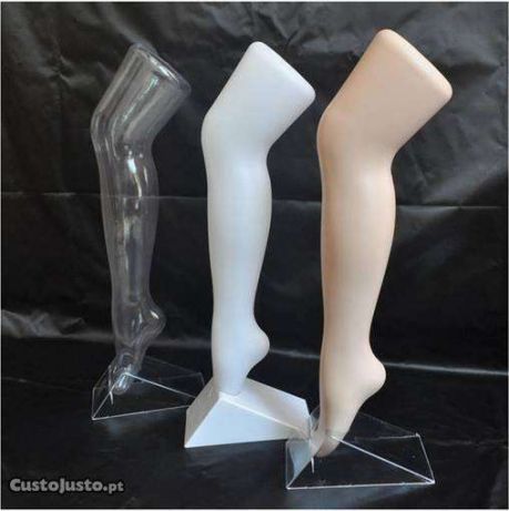 Três manequins de pernas femininas em plástico, uma transparente, uma branca e uma bege, com bases triangulares.